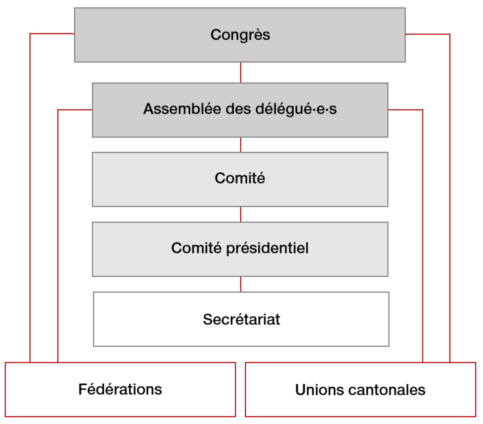 À l'échelon cantonal et local, les sections des fédérations de l'USS forment les unions syndicales cantonales ou locales qui remplissent à leur niveau des fonctions similaires à celles de l'USS sur le plan fédéral.