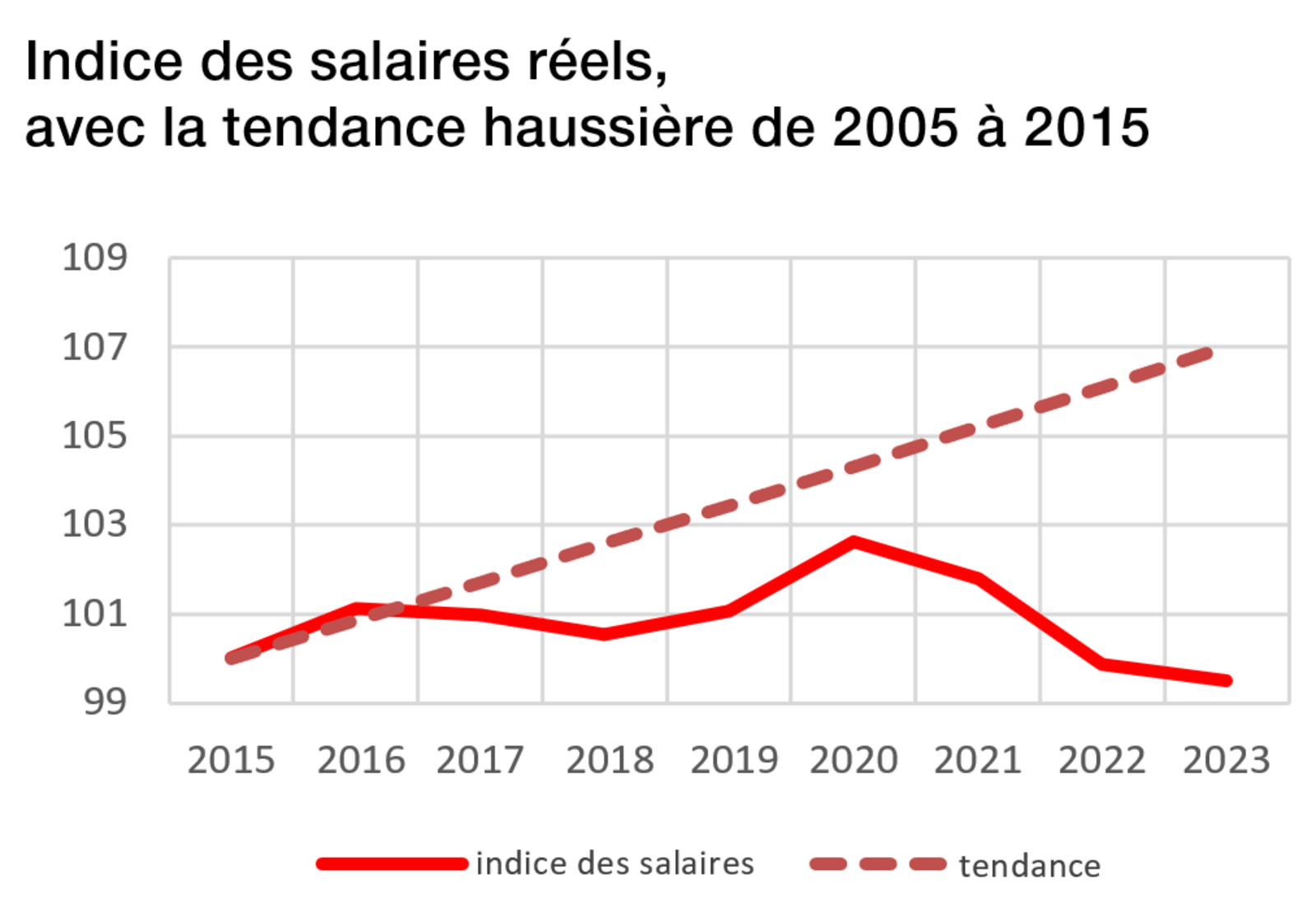 Les employeurs ont privé leur personnel d’augmentations méritées. Dans le passé, les salaires réels progressaient plus au moins au même rythme que la productivité. L’indice des salaires affiche ainsi, entre 2005 et 2015, une hausse proche de 0,9 % par an. Après 2015, les travailleuses et travailleurs ont continué à contribuer largement à la croissance économique. Les salaires devraient dès lors se situer aujourd’hui, en valeur réelle, près de 7 % au-dessus de leur niveau actuel. D’où un énorme besoin de rattrapage salarial.